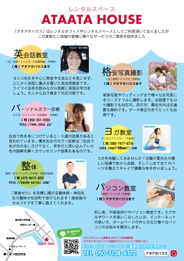 これまでレンタルスペースでサロン業をして頂いている先生方の事業のご紹介と、アタアタハウス独自のサービスなどご紹介したフライヤーです。